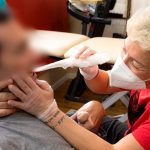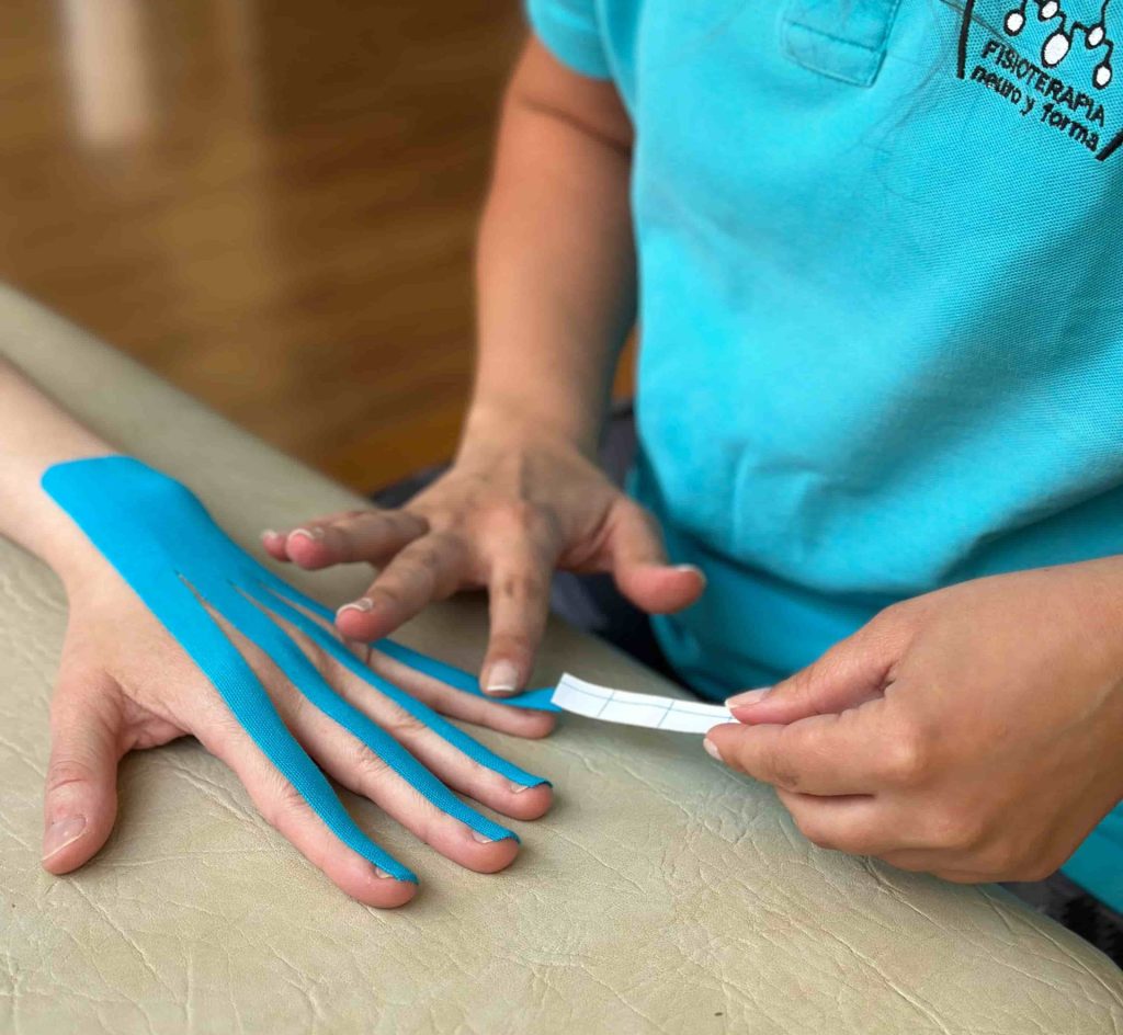 Aplicación de cintas elásticas adhesivas sobre la piel con fines terapéuticos.