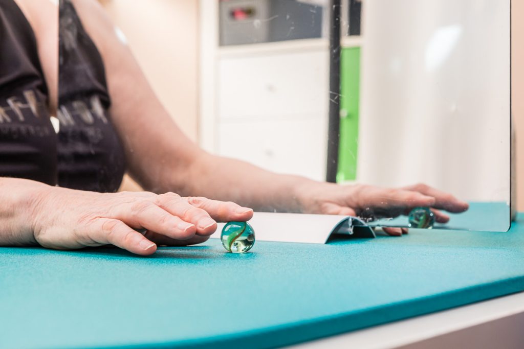 Se trabaja desde el área de Terapia Ocupacional, consiste en colocar un espejo entre los brazos o las piernas del paciente para que la imagen del miembro no afecto proporcione la ilusión de un movimiento normal en el miembro afectado. A través de esta estimulación visual se estimula la activación de los circuitos neuronales motores que han sufrido la lesión.
